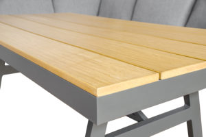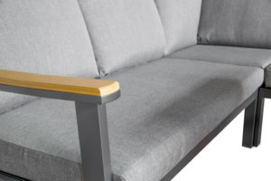 Stap binnen in de wereld van ultiem comfort en tijdloze elegantie met onze Cornerset, een mix van design en functionaliteit. Deze prachtige loungeset combineert een strak aluminium frame met warme polywood armleuningen, waardoor een verfijnde balans ontstaat tussen een moderne look en natuurlijke schoonheid.