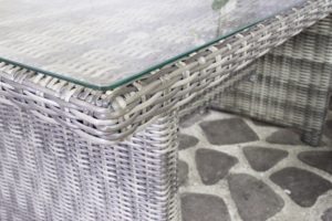 - Tafelblad materiaal: gerookt glas op een aluminium frame met halfrond wicker